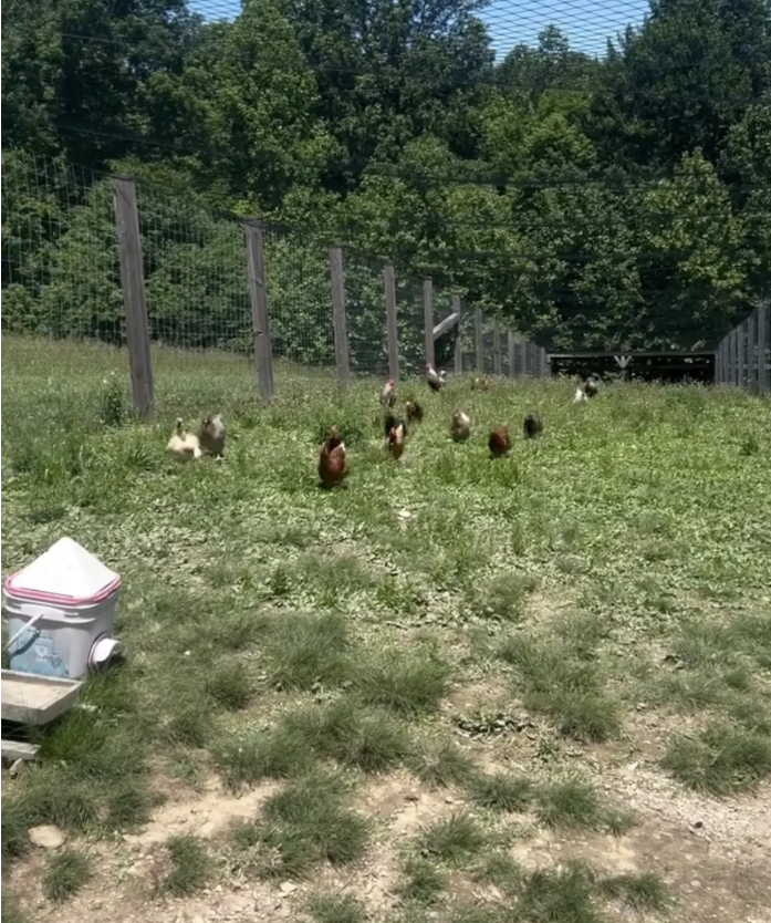 Over time, Carrie and her family transformed their land into a thriving farm. Chickens roam freely near their coop, providing fresh eggs daily, while fruit trees and berry plants supply apples, peaches, blueberries, and blackberries.