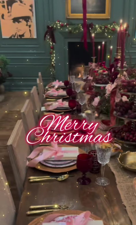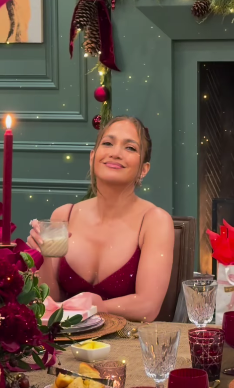 Near the fireplace, holiday gift bags tied with pink bows and vibrant red tissue paper echo the home’s sophisticated color palette. The video concludes with Lopez seated at the head of the table, raising her glass in a celebratory toast a moment that perfectly captures the spirit of the season.