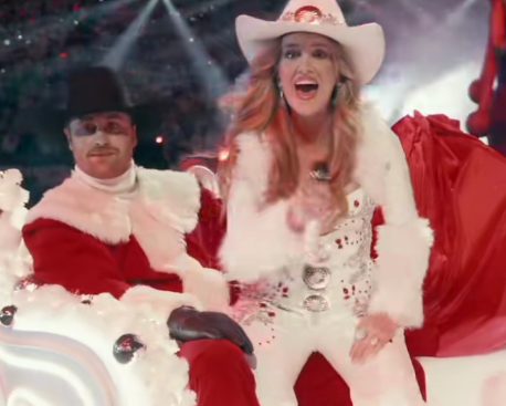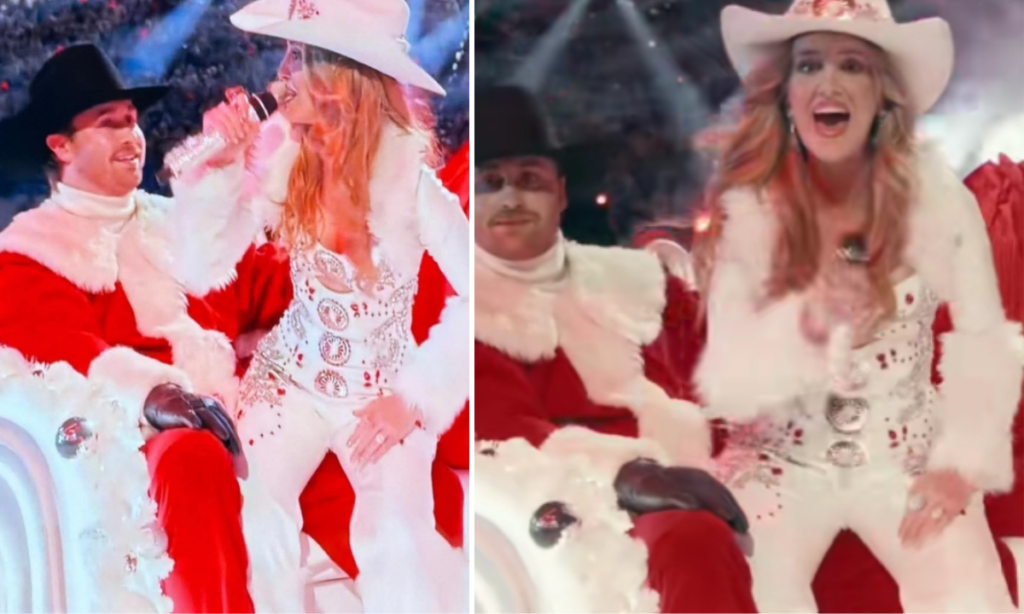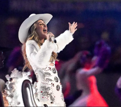 Making a dramatic entrance that instantly captured attention, Lainey arrived at midfield in a festive sleigh, dressed in a shimmering white winter jumpsuit paired with her signature cowboy hat. The look perfectly balanced elegance and authenticity two qualities that have become hallmarks of her career. As snowflake-inspired visuals filled the stadium screens, Wilson launched into a holiday-themed rendition of “Santa Claus Is Coming to Town,” putting her own country twist on the timeless classic.
