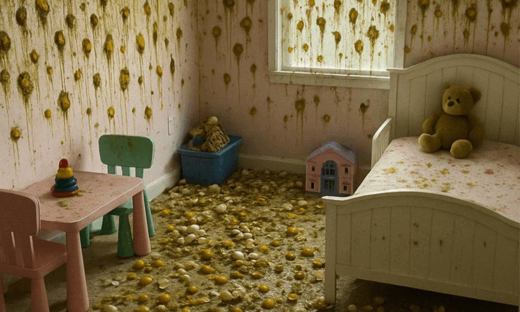 Three days later, I came home with Sadie to a horrifying smell. Following the stench, I opened the playroom door -and froze. Rotten eggs were smeared all over the walls, dripping onto the brand-new carpet. Sadie’s toys, books, and stuffed animals were destroyed.