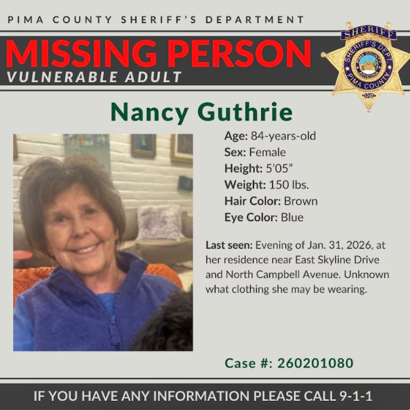 Nancy Guthrie, 84, was last seen on the night of Jan. 31. Authorities believe she was abducted from her home in the Catalina Foothills neighborhood north of Tucson, Arizona.